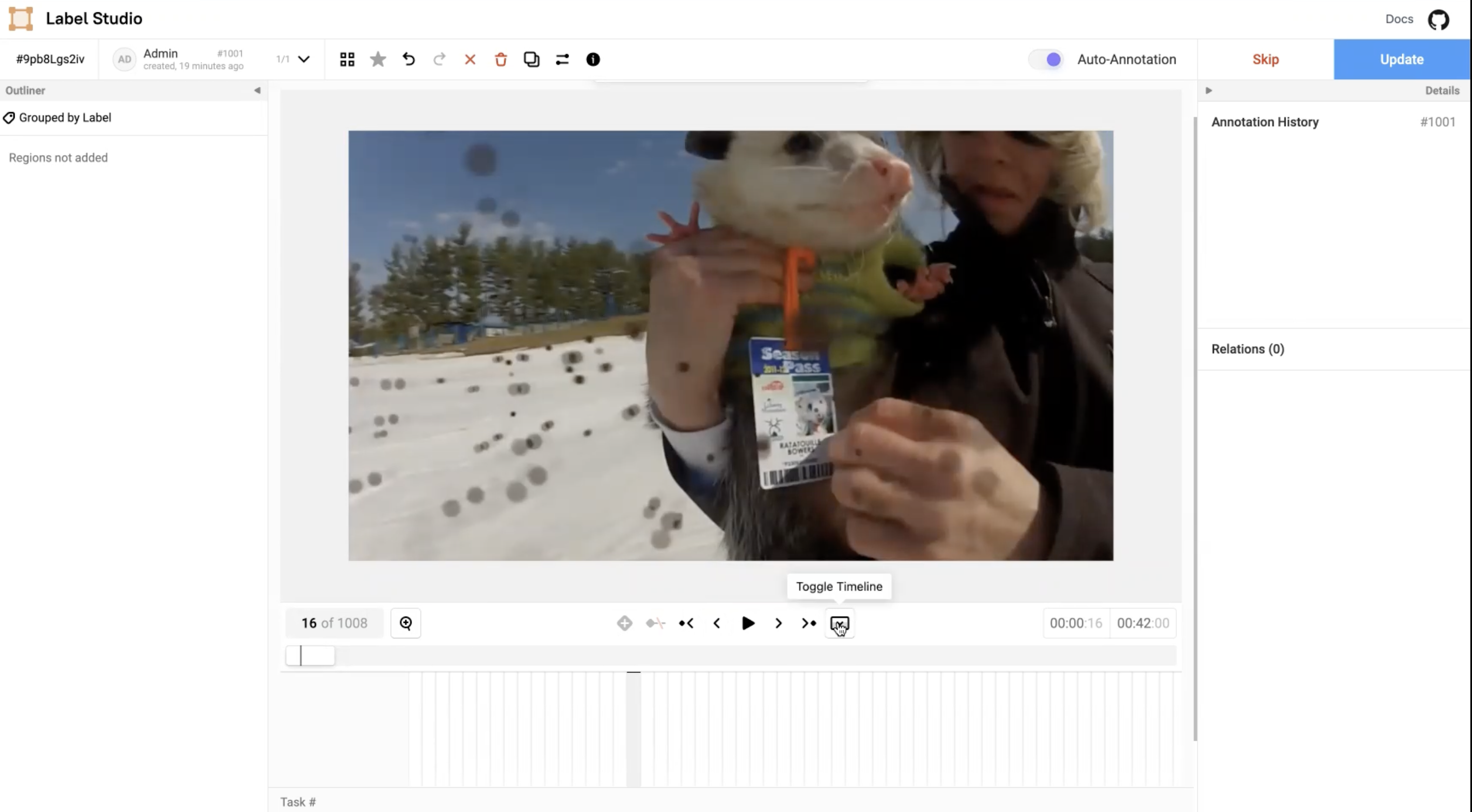 You can reconfigure the annotation workspaces to simplify labeling larger tasks, including large images and longer videos with many regions. This allows you to view more of the video portion, a wider space for the timeline, and the ability to see many keyframes and regions.